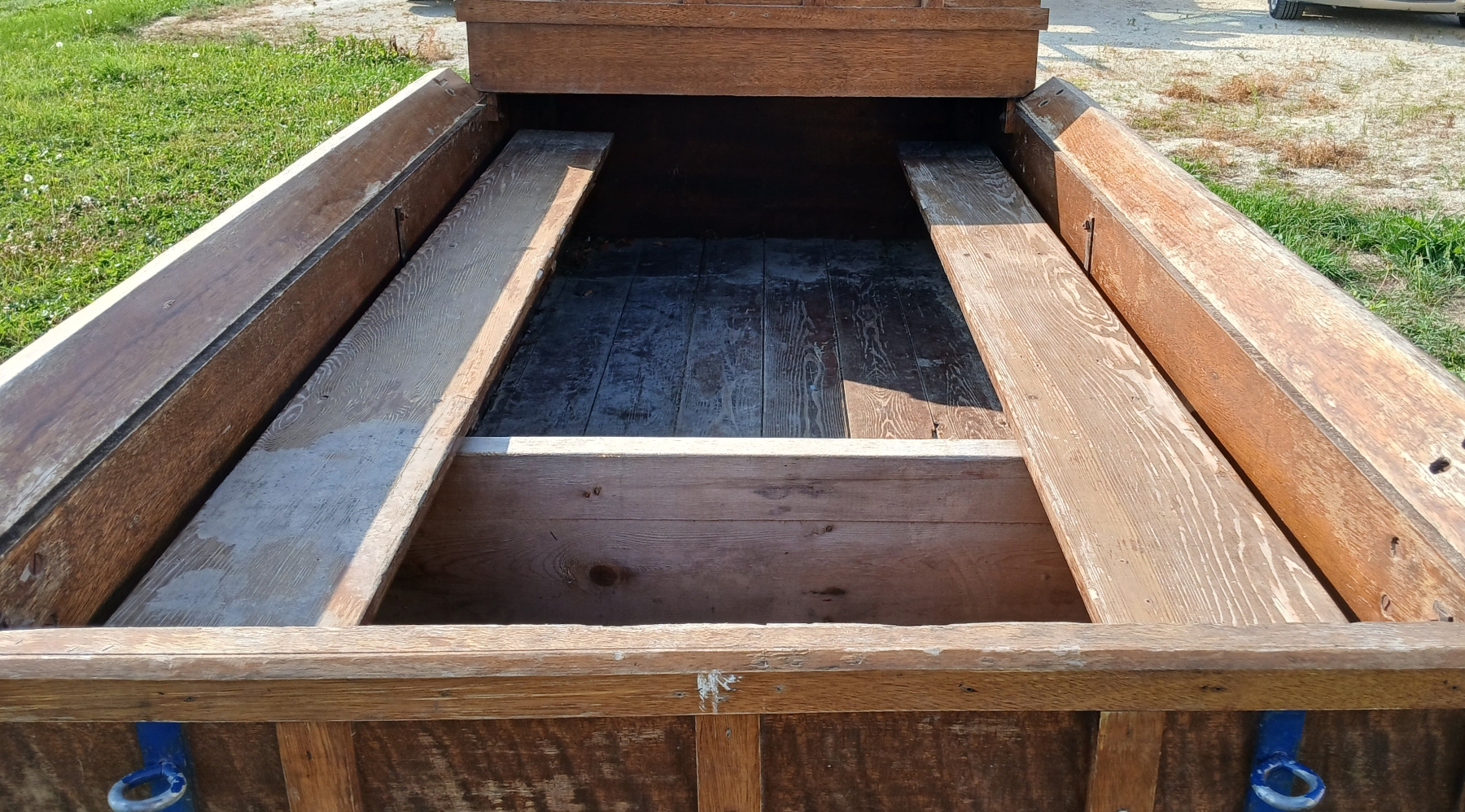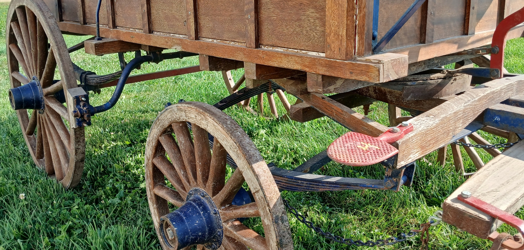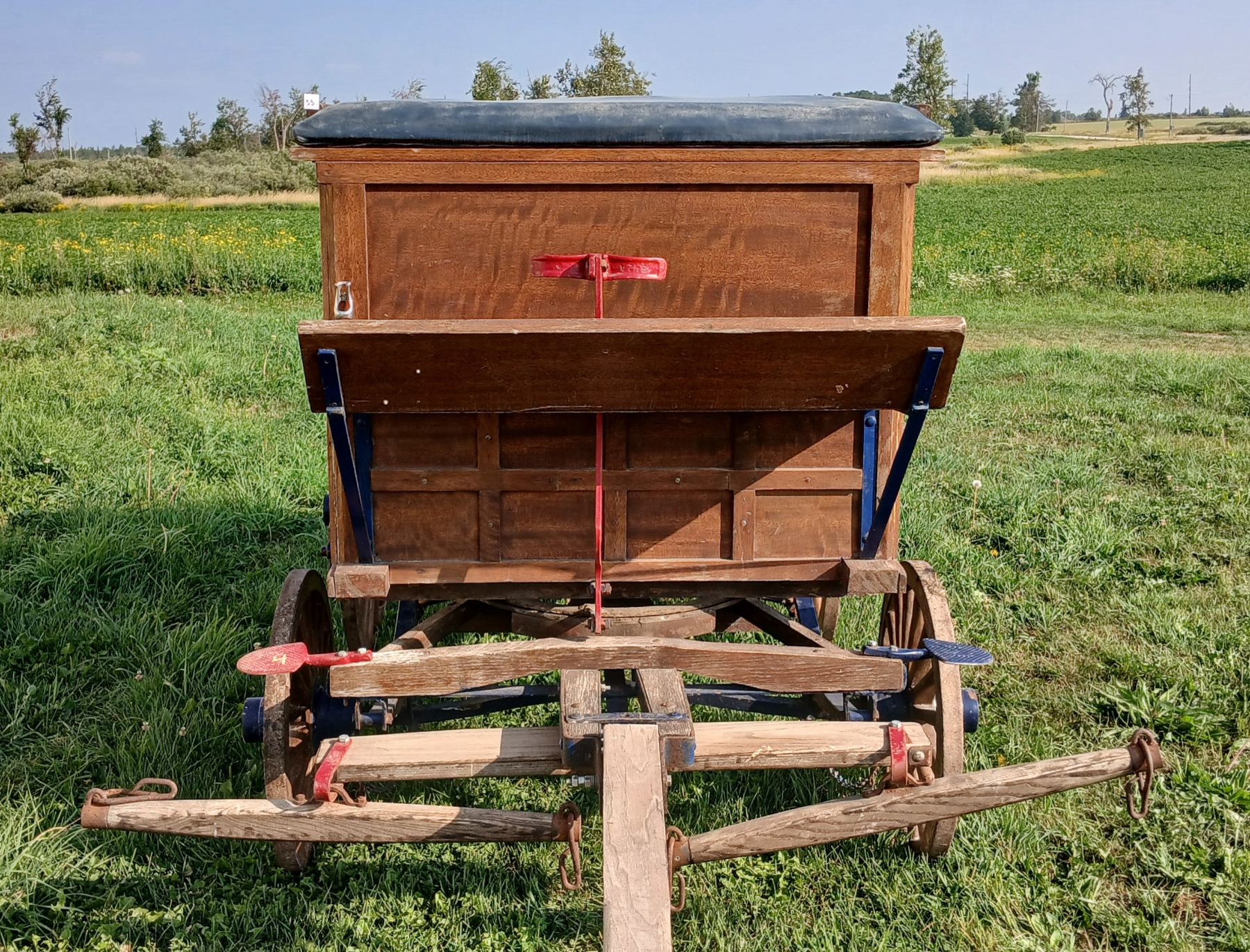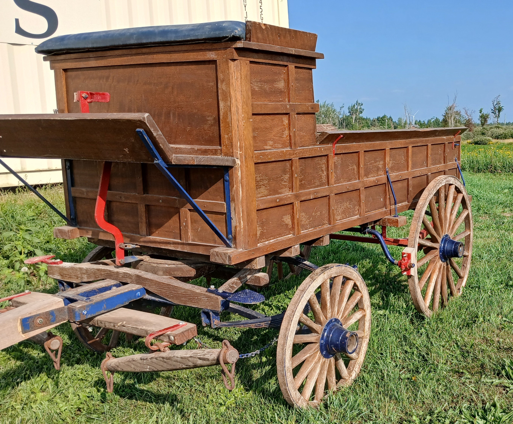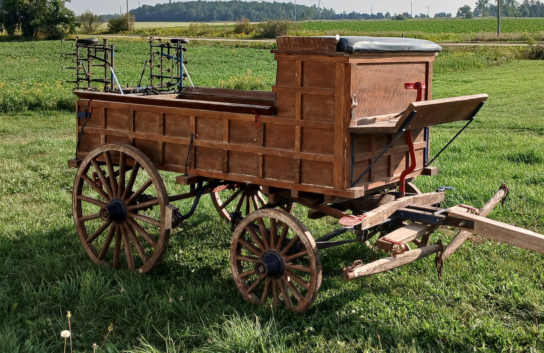NOTE: 34IN DIA BACK WHEELS - 24IN DIA FRONT WHEELS - 32IN WHIPPLETREES - BOX IS 40 X 89IN - TONGUE LENGTH IS 11FT