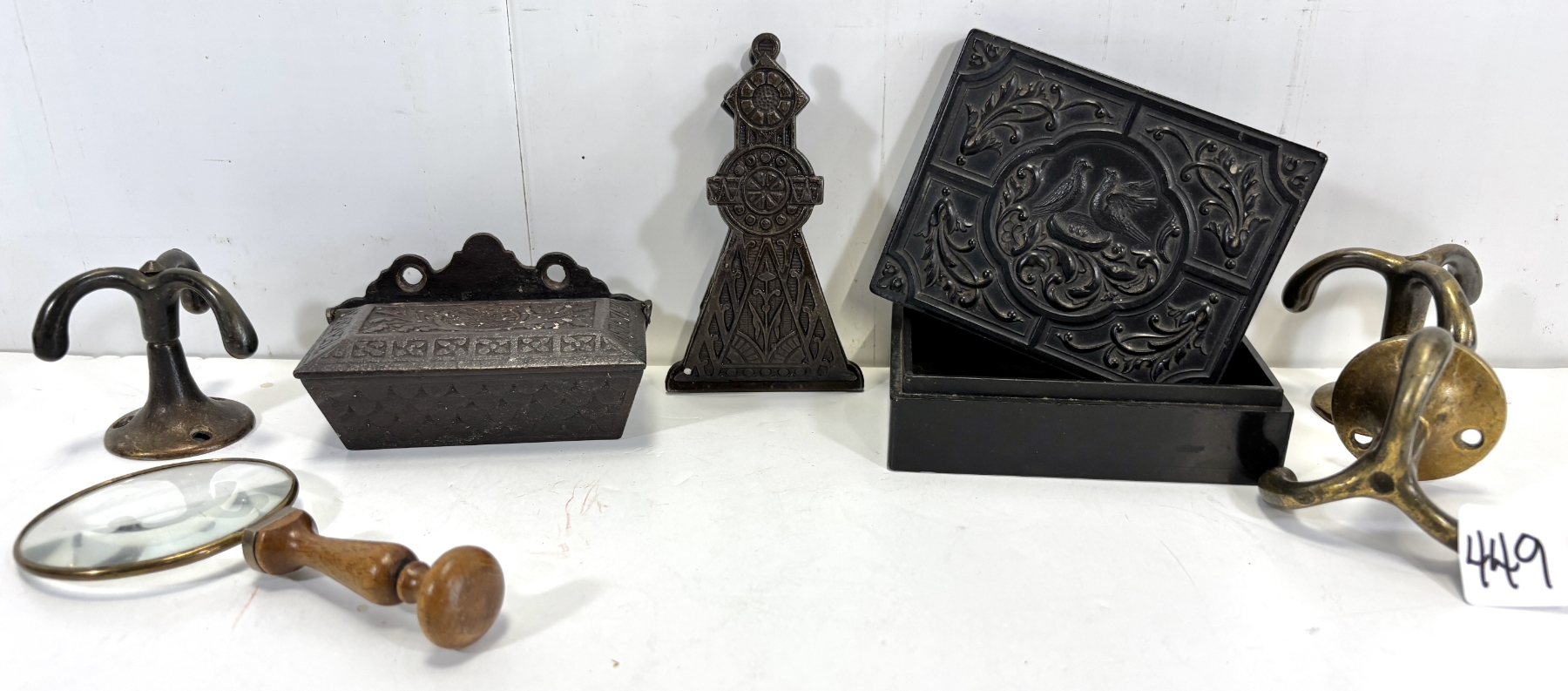 JOB LOT - MATCH HOLDER, LETTER HOLDER, TRINKET BOX, SWIVEL HOOKS, MAGNIFYING GLASS