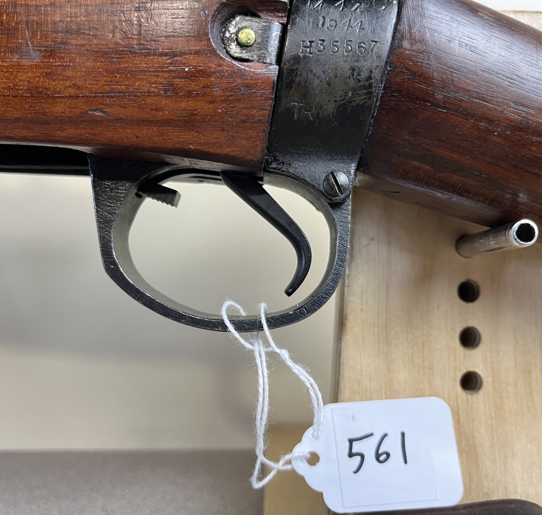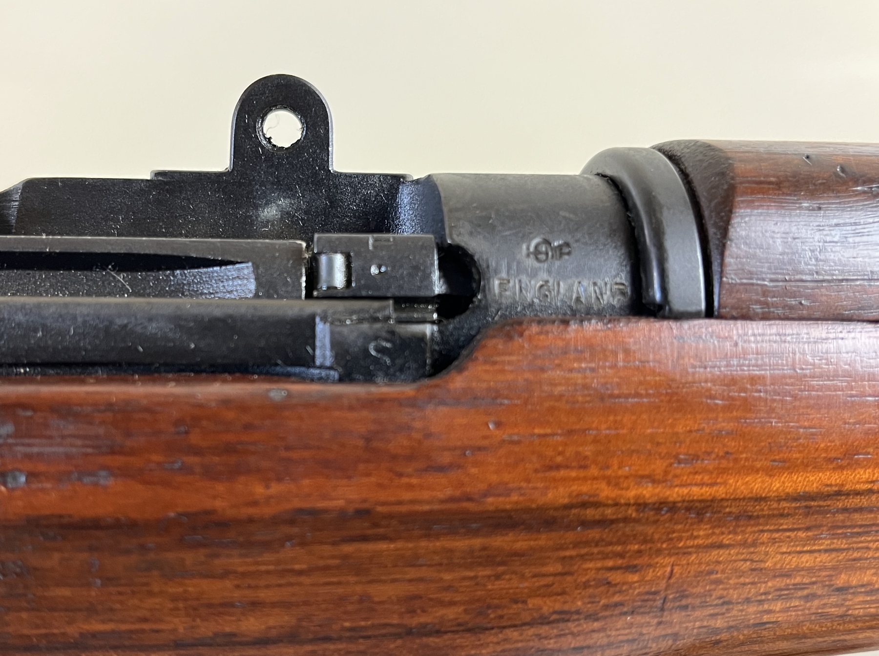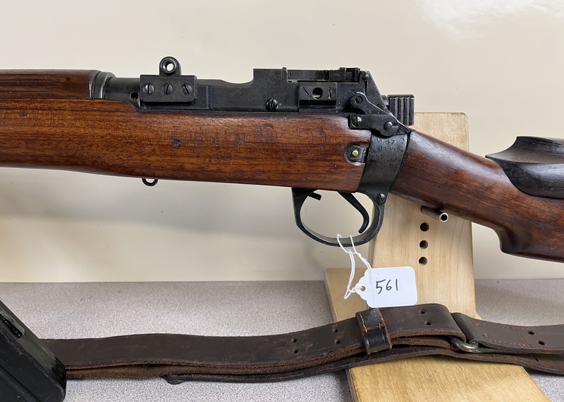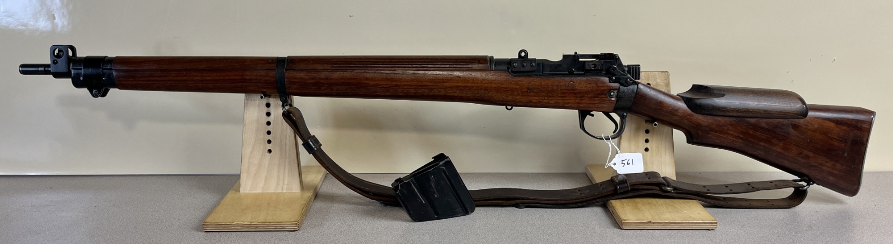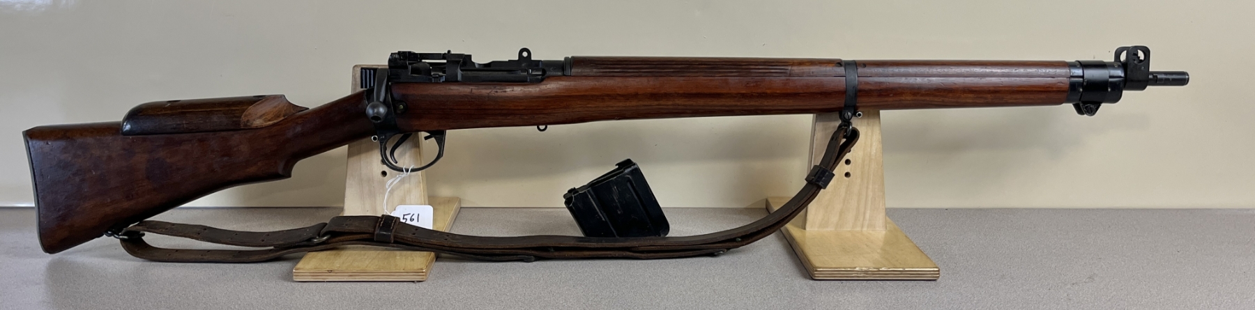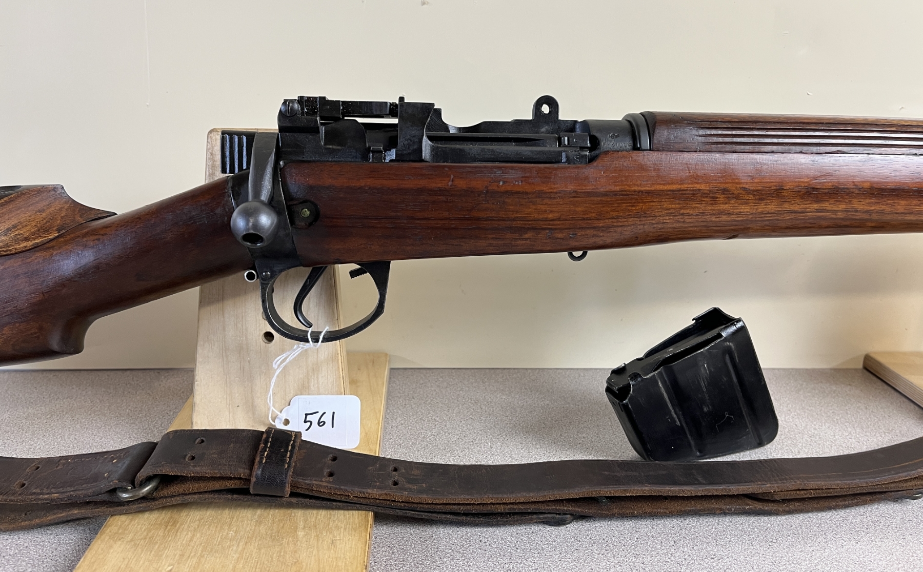 CONDITION: VG OVERALL INCL BORE. SPECS: 25-1/4IN BBL. INCL 1X MAG. SHOWS BRITISH BROAD ARROWS, TR NEAR REAR TRIGGER GUARD SCREW, S51 ON BOTTOM OF STOCK, AND S ON THE RIGHT SIDE OF RECEIVER JUST ABOVE WOODLINE. EXTRAS: TRANSIT CASE. CDN BROAD ARROW LEATHER SLING. S/N: H35567 MATCHING ON BOLT, WRIST BAND, AND LOWER FORESTOCK.
