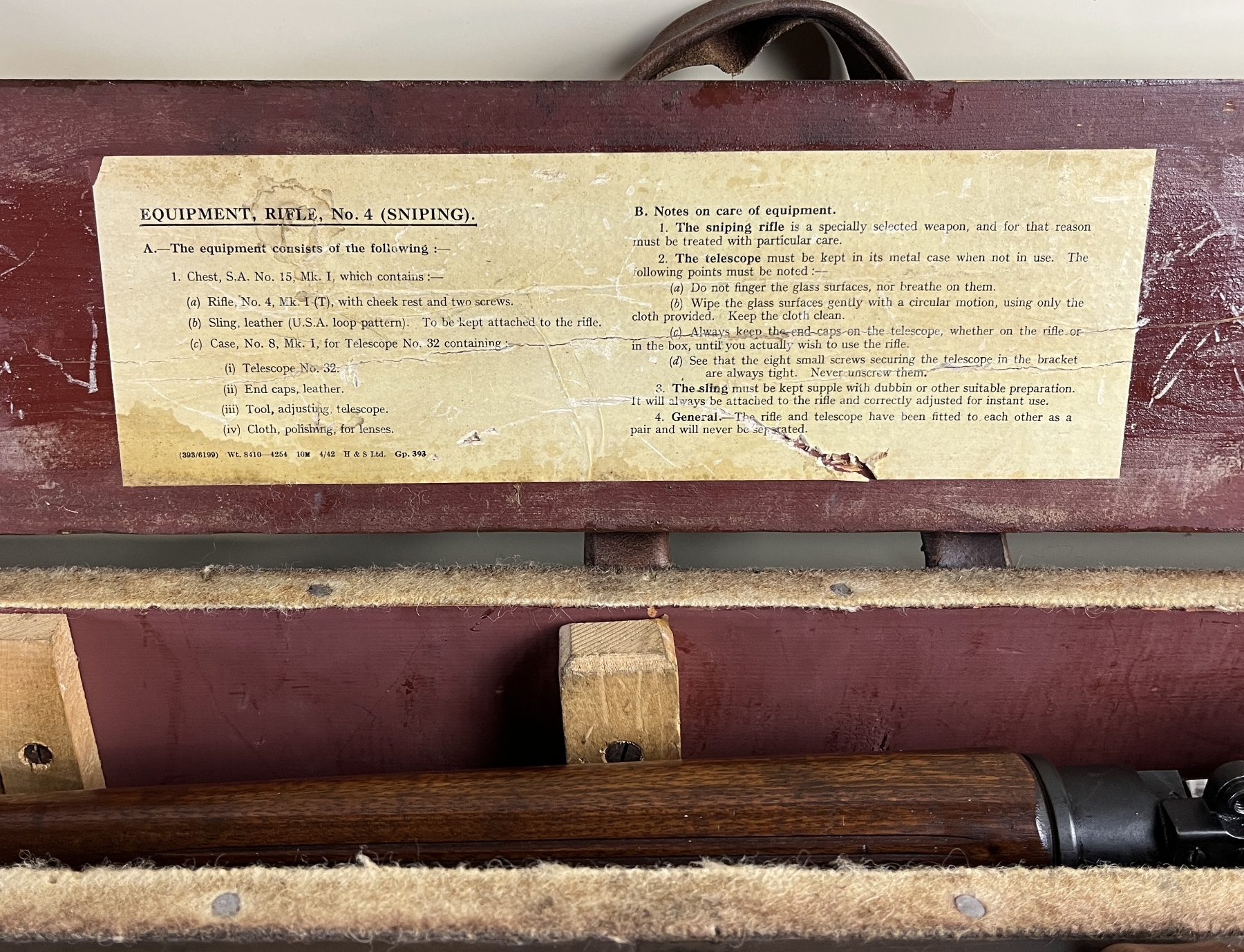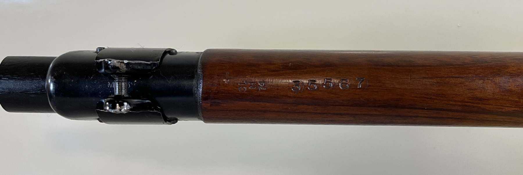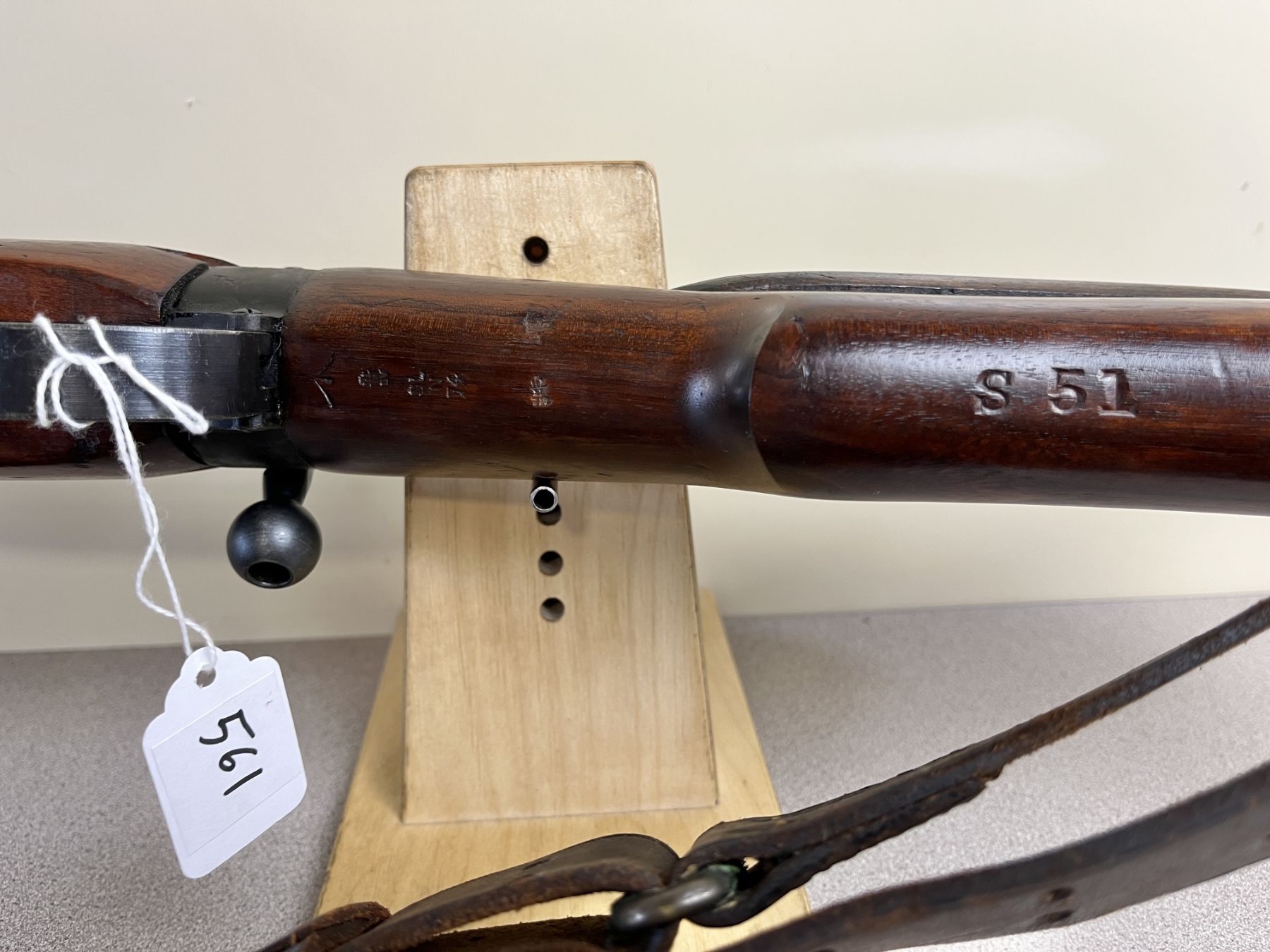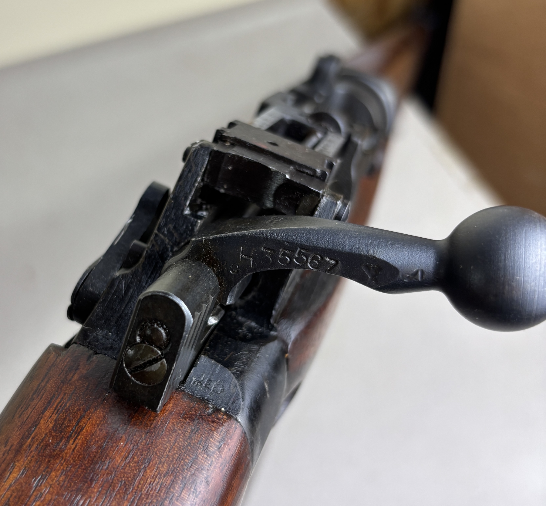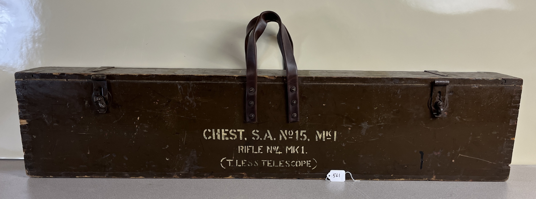 CONDITION: VG OVERALL INCL BORE. SPECS: 25-1/4IN BBL. INCL 1X MAG. SHOWS BRITISH BROAD ARROWS, TR NEAR REAR TRIGGER GUARD SCREW, S51 ON BOTTOM OF STOCK, AND S ON THE RIGHT SIDE OF RECEIVER JUST ABOVE WOODLINE. EXTRAS: TRANSIT CASE. CDN BROAD ARROW LEATHER SLING. S/N: H35567 MATCHING ON BOLT, WRIST BAND, AND LOWER FORESTOCK.