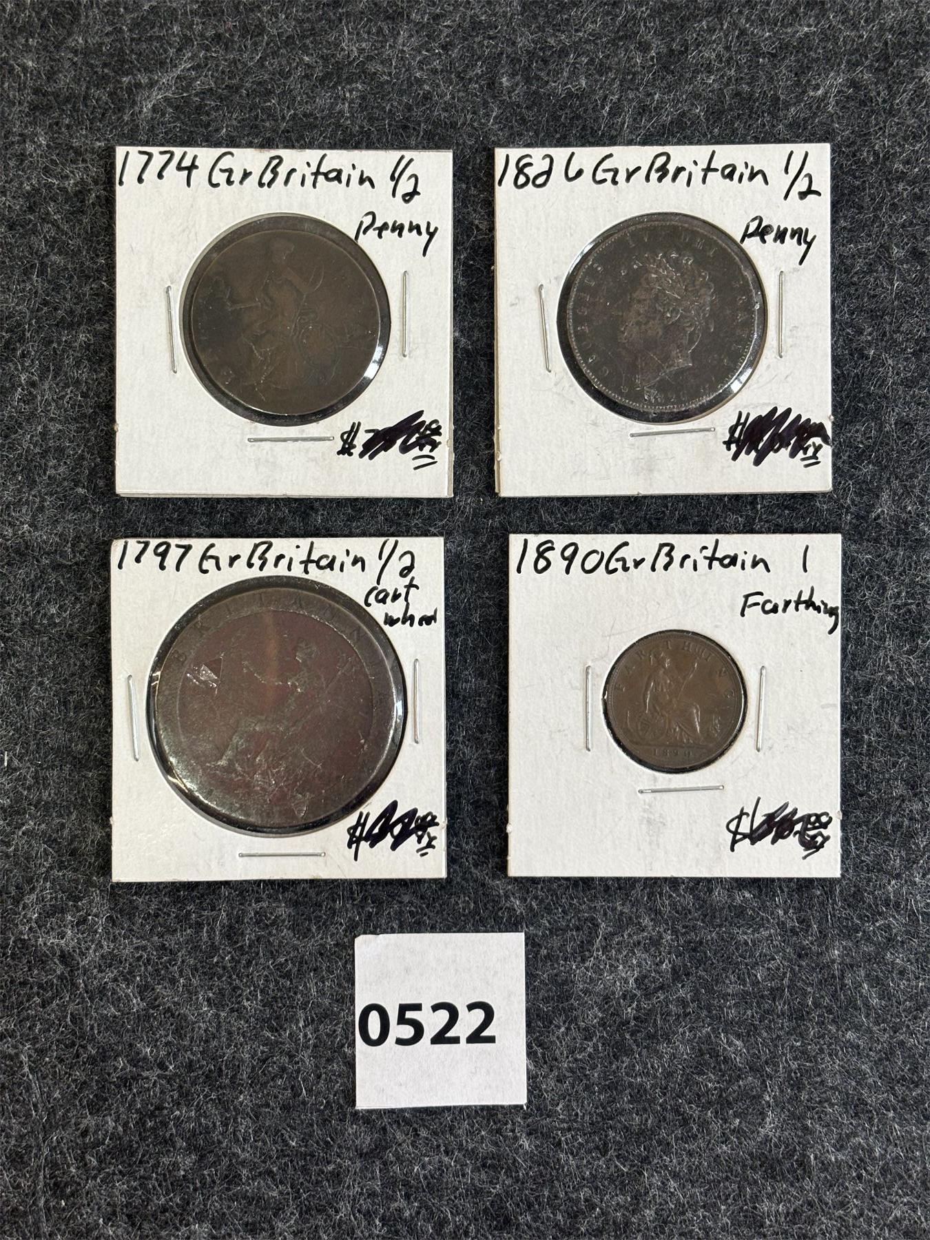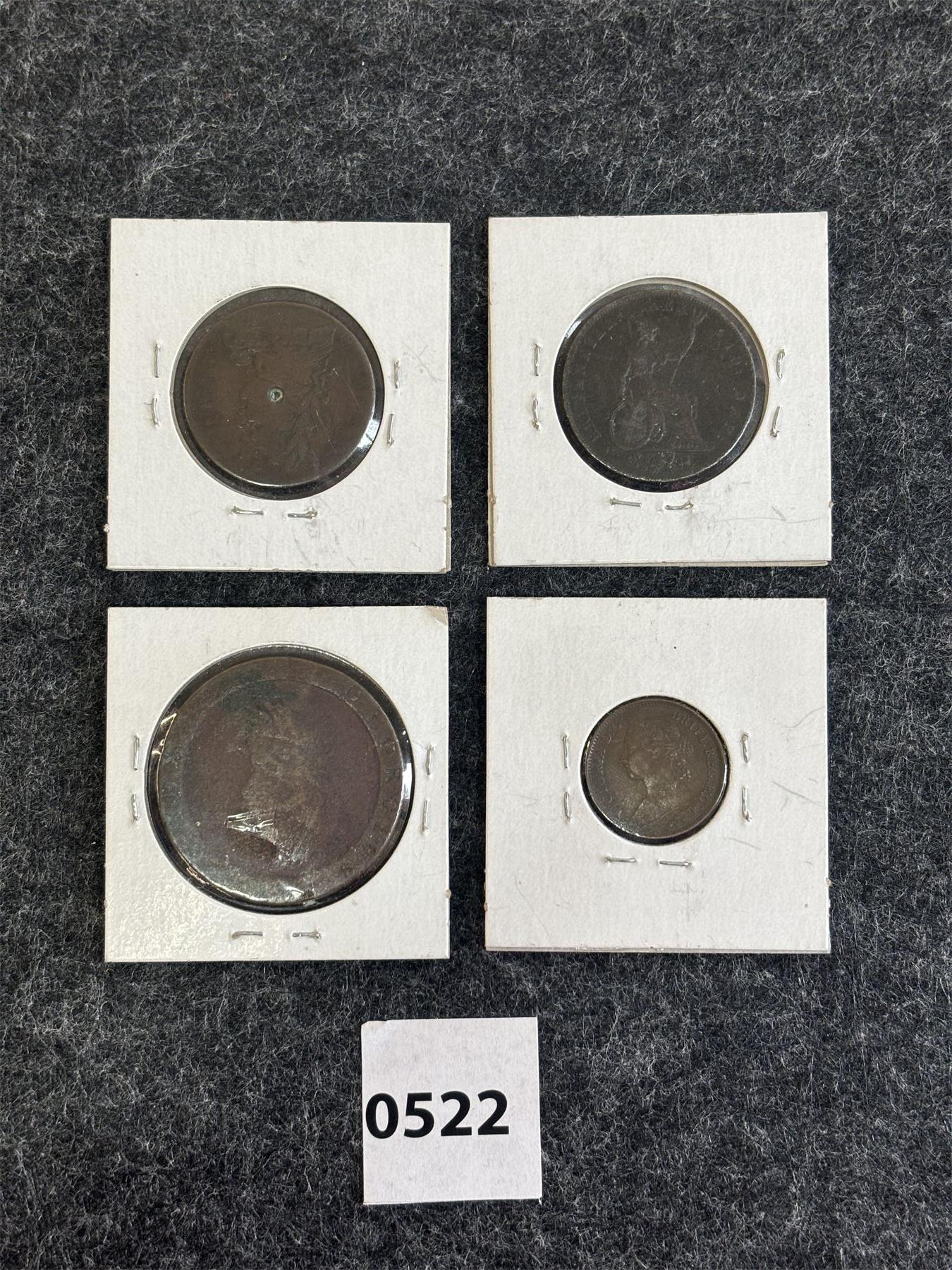 LOT OF 4 - EARLY WORLD COINS - INCL 1774 GREAT BRITAIN HALF PENNY, 1797 CARTWHEEL PENNY, ETC.