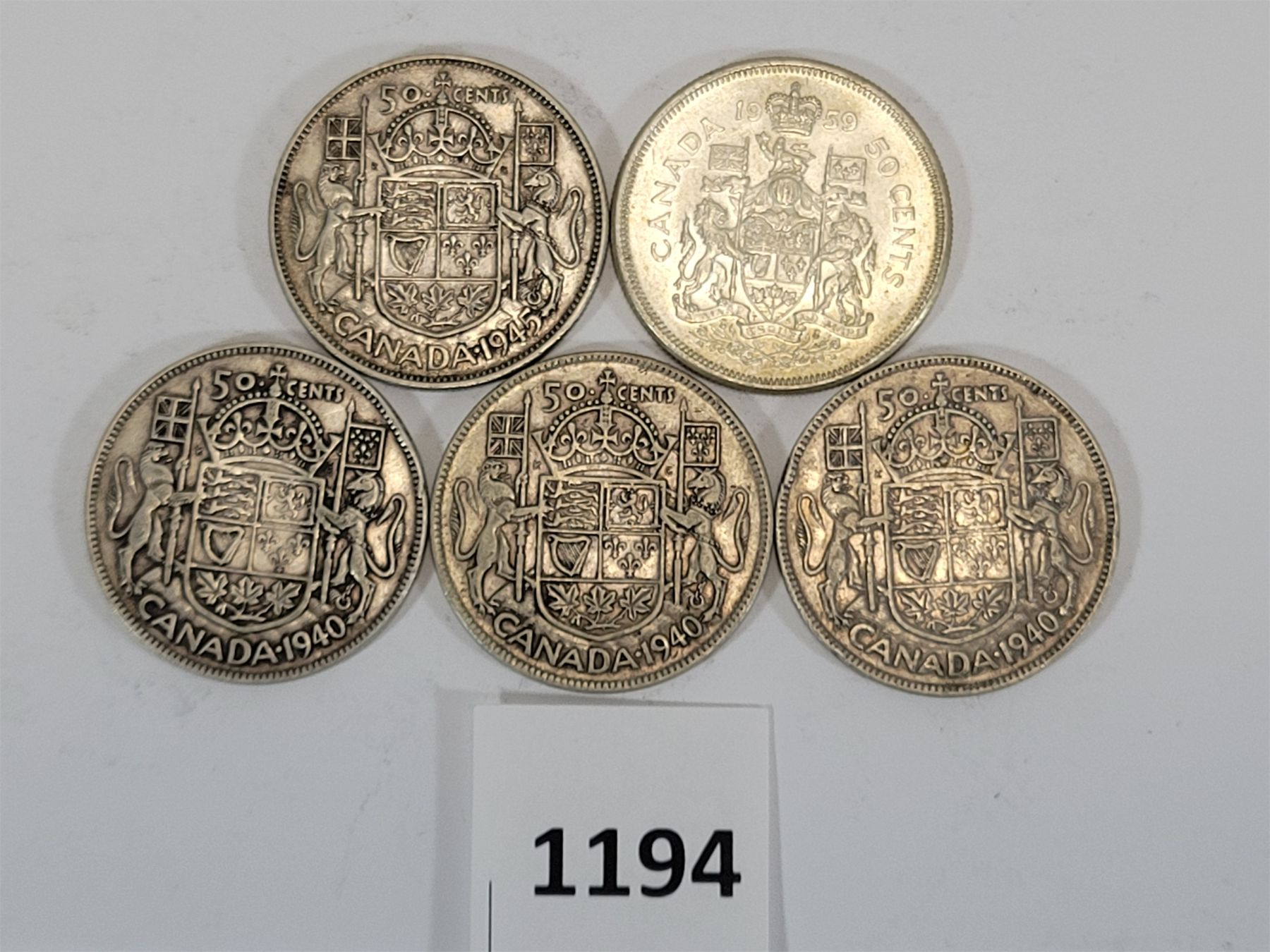 LOT OF 5 - 1940, 1945 & 1959 CDN SILVER 50 CENT PCS