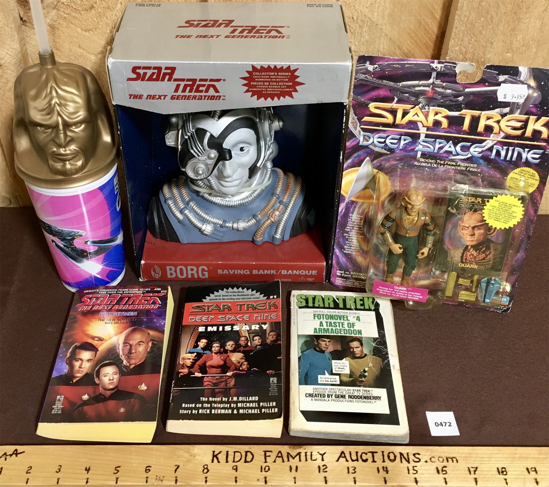 LOT OF 6 - STAR TREK COLLECTIBLES - DS9 QUARK FIGURE, TNG BORG COIN BANK, PUBLICATIONS ETC.