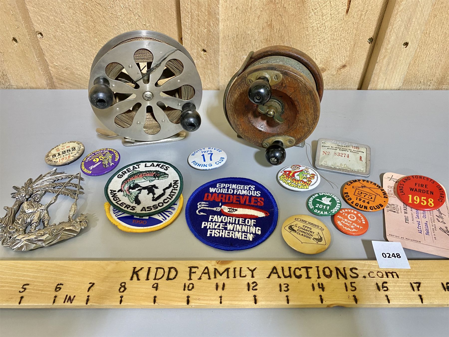 LOT OF SPORTSMAN COLECTIBLES - ANTIQUE REELS, BADGES, PINS, LICENCES, ETC