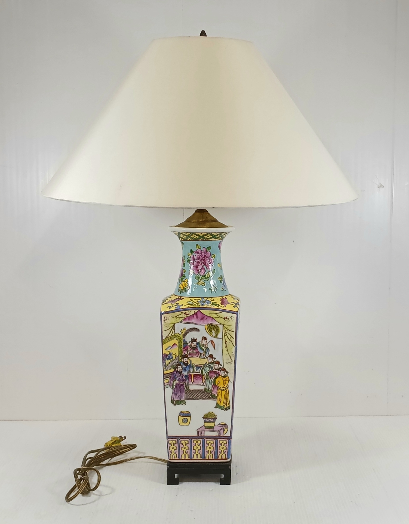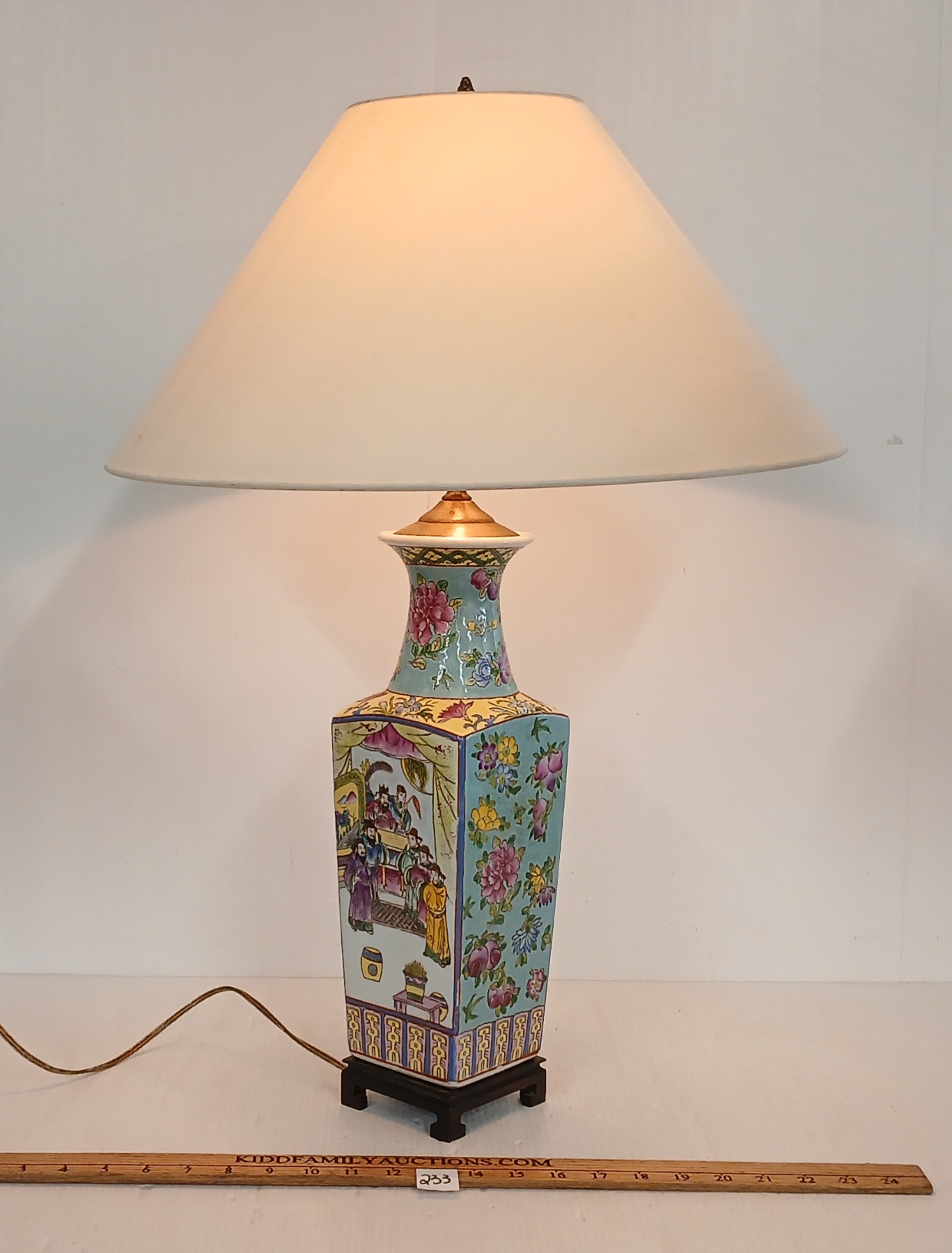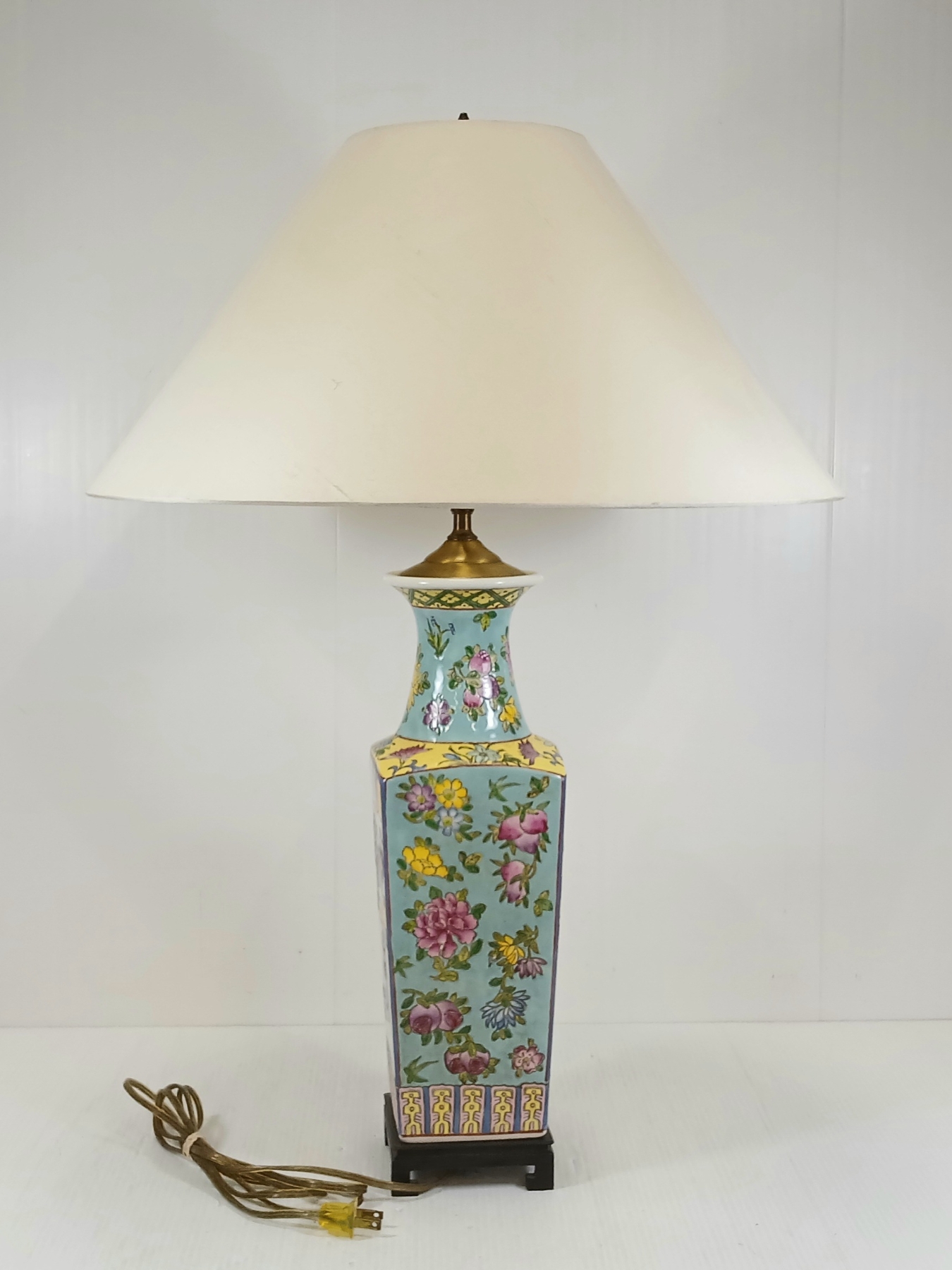 NOTE: MADE IN HONG KONG - MARKED ON BOTTOM - 18.5IN DIA LAMP SHADE - 4 X 4 X 27IN - WORKING WHEN TESTED - BULB NOT INCLUDED