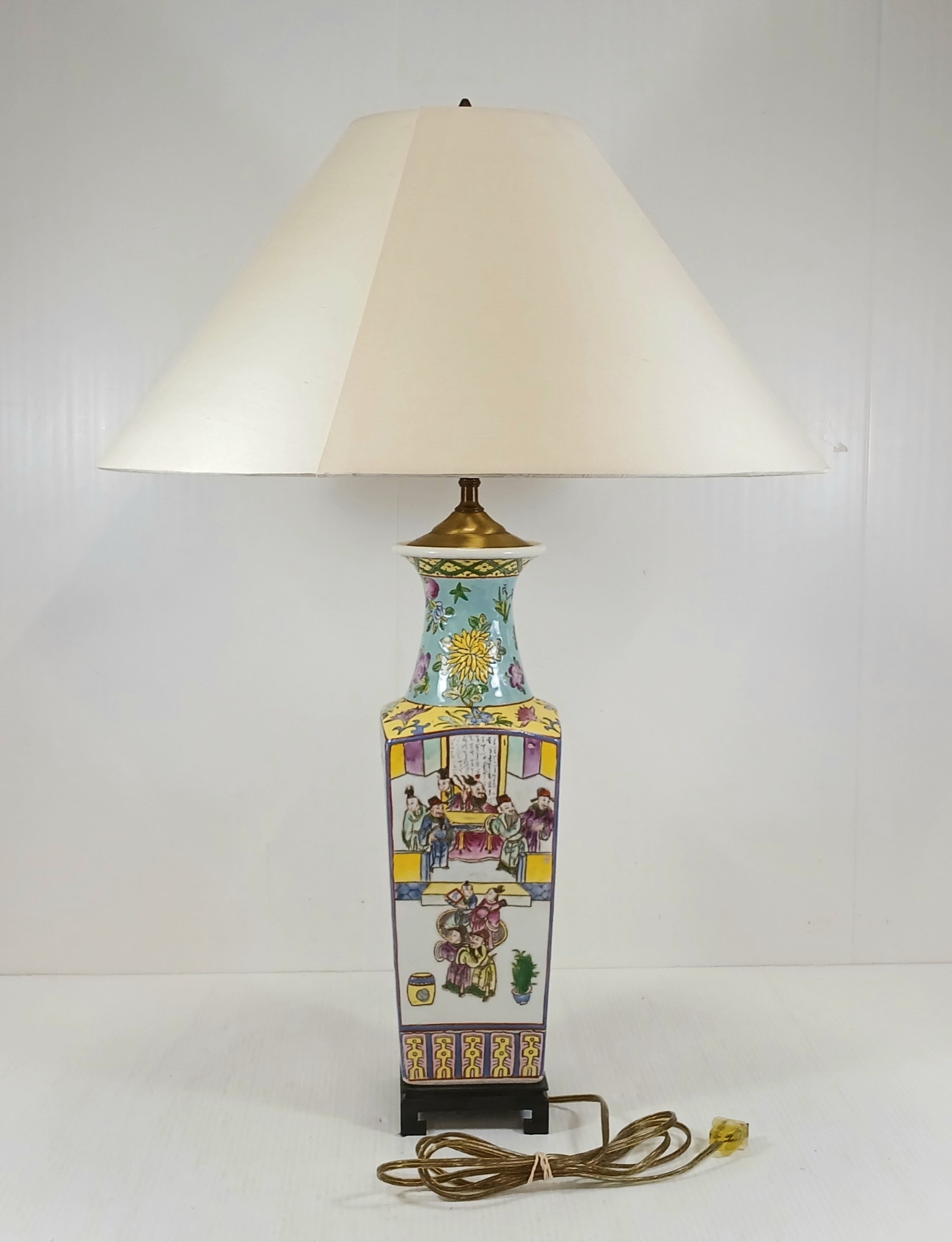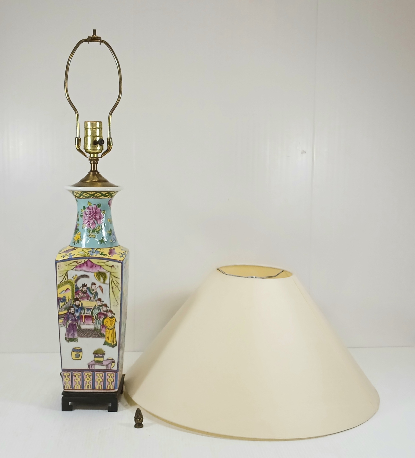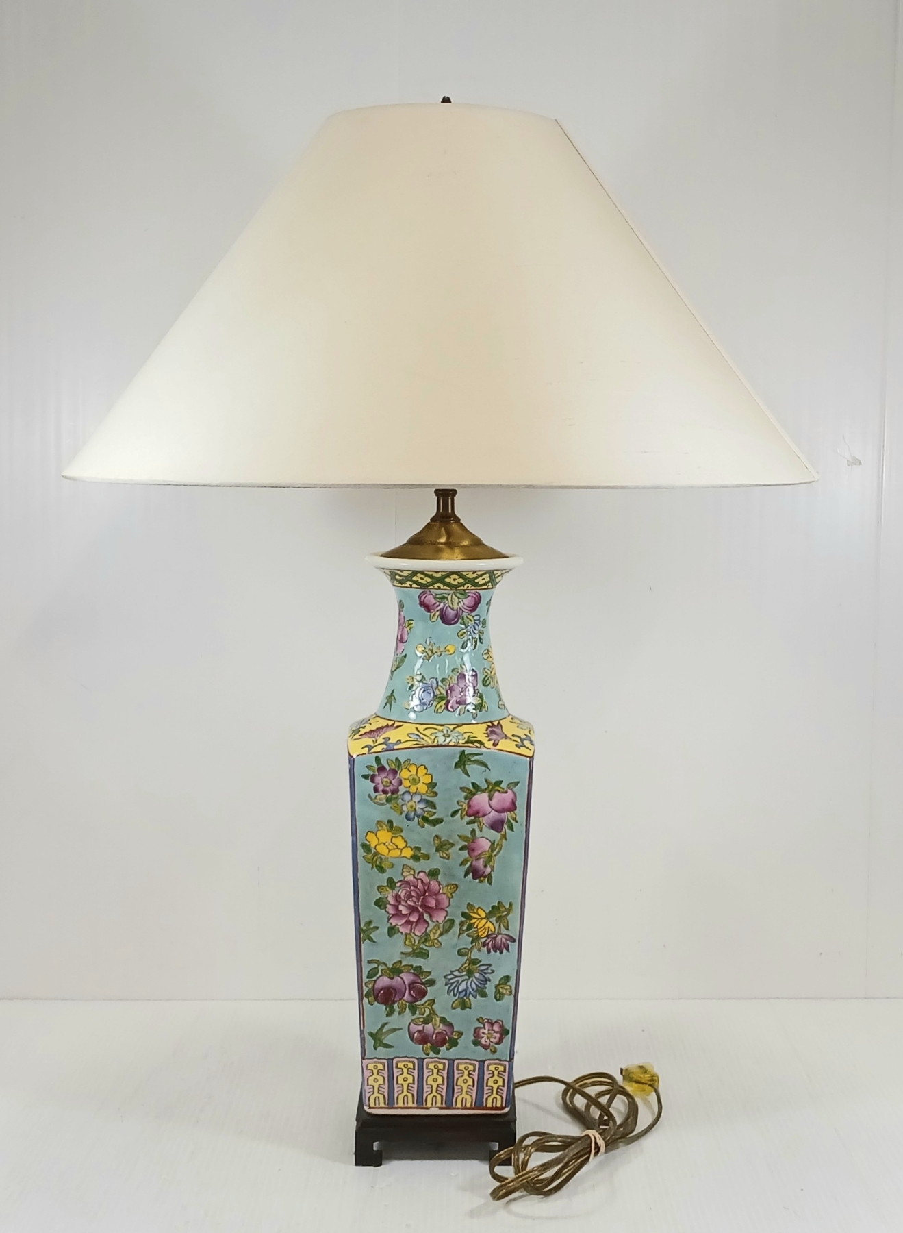 NOTE: MADE IN HONG KONG - MARKED ON BOTTOM - 18.5IN DIA LAMP SHADE - 4 X 4 X 27IN - WORKING WHEN TESTED - BULB NOT INCLUDED