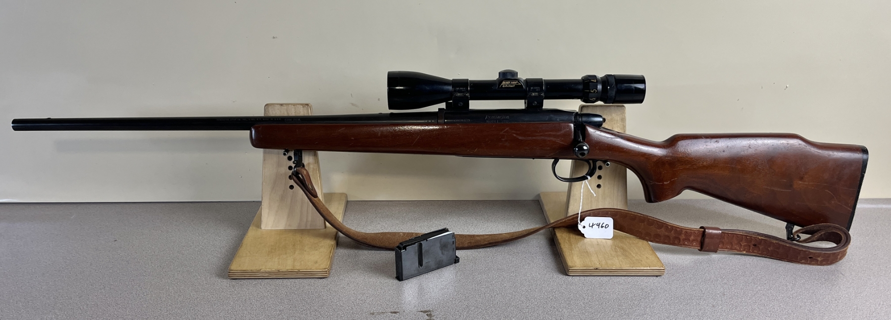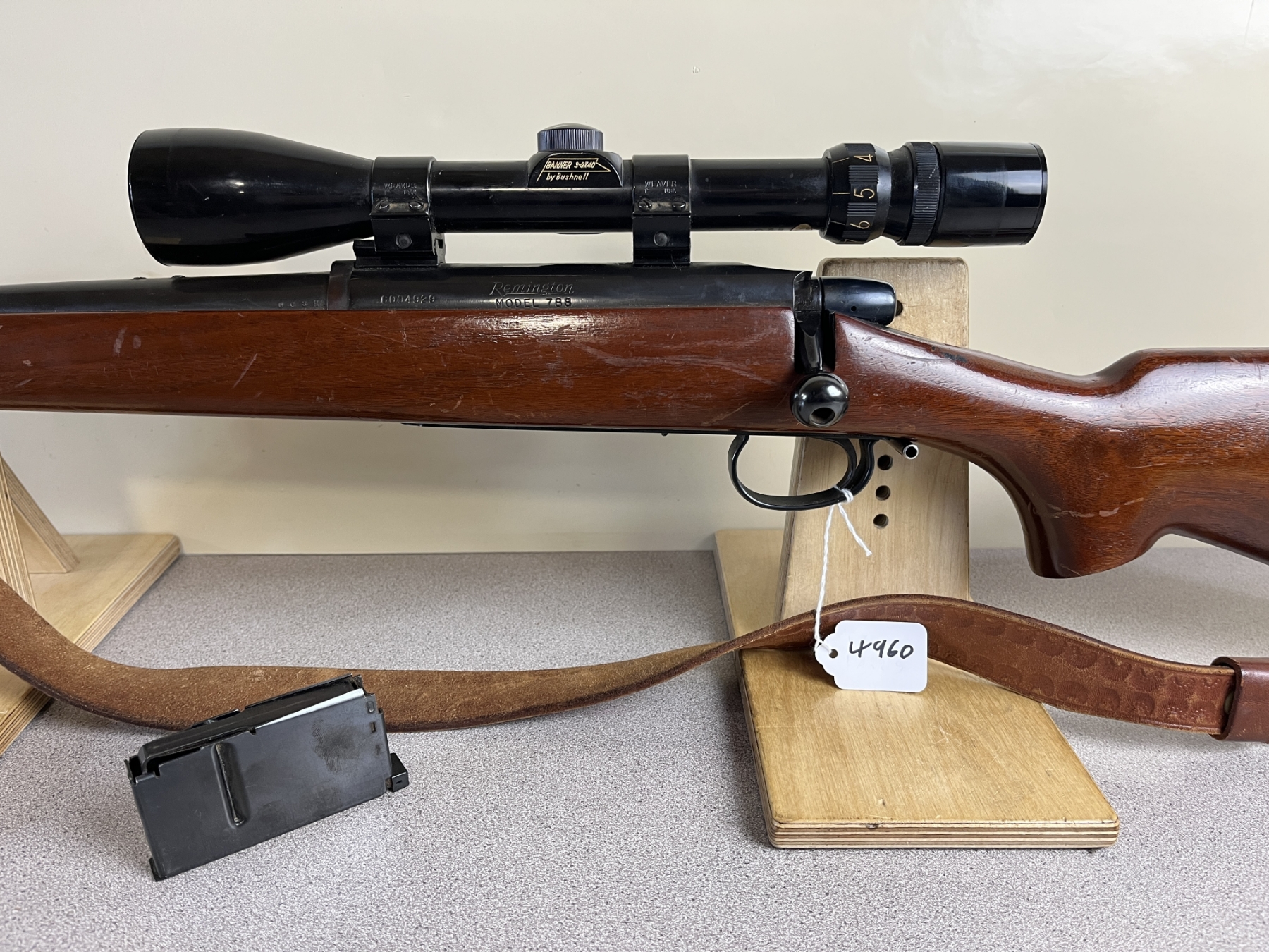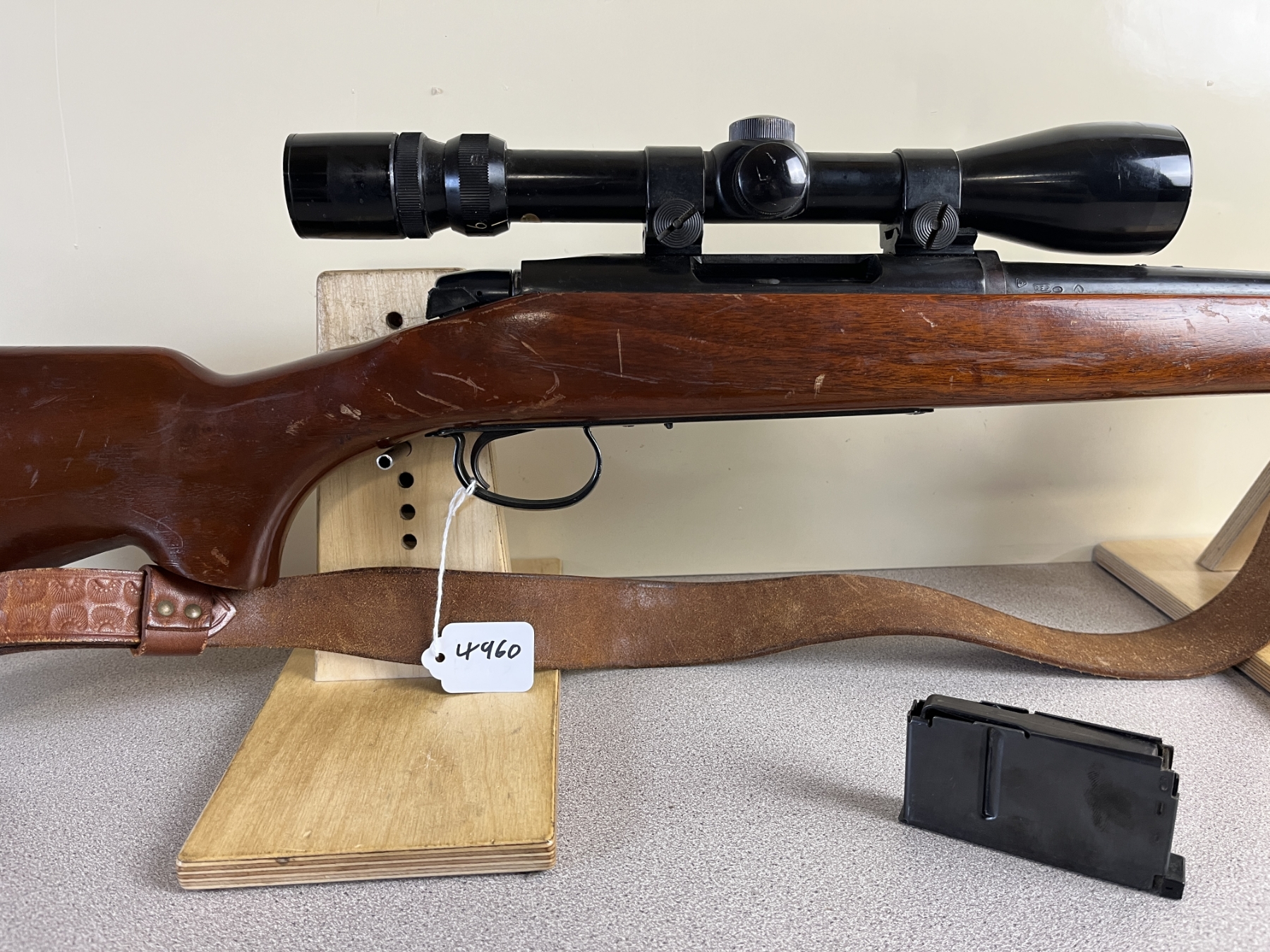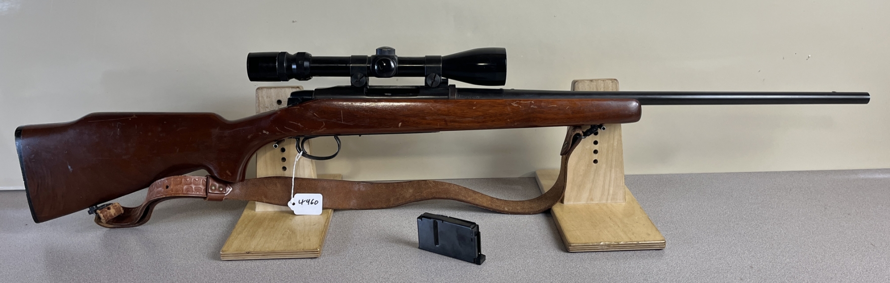 CONDITION: F-G OVERALL G-VG BORE. NOTE: SAFETY APPEARS STUCK IN THE FIRE POSITION, TRIGGER MAY BE RELEASING UPON BOLT CLOSE. SPECS: 21-1/2IN BBL. INCL 1X MAGAZINE. EXTRAS: LEATHER SLING. BUSHNELL BANNER 3-9X40 SCOPE CLEAR WITH CROSSHAIRS. S/N: 6004929