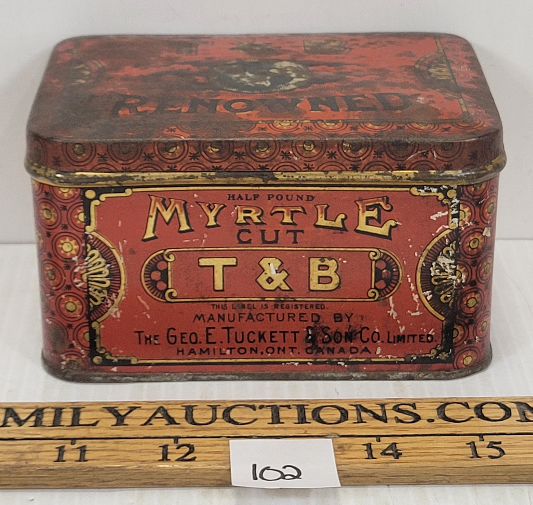 T & B RENOWNED MYRTLE CUT TOBACCO TIN - HAMILTON, ONT