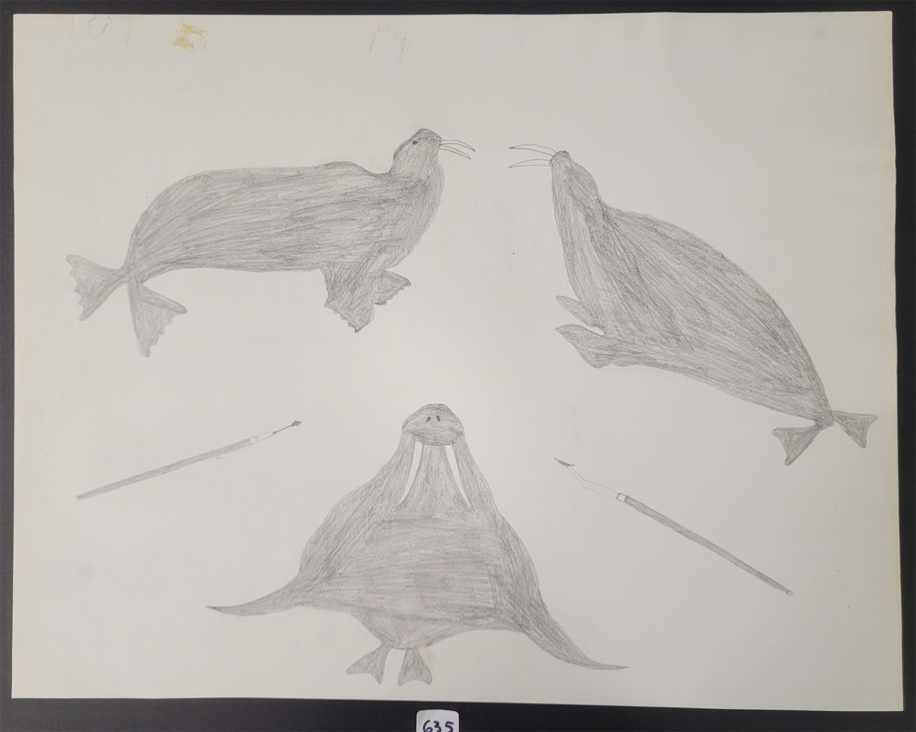THREE WALRUS' AND TWO HARPOONS  BY SHEOUAK - PENCIL - CIRCA 1960