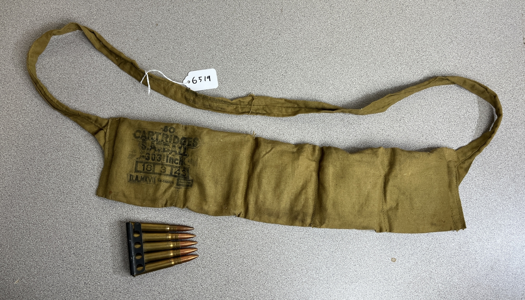 MARKED 18/3/43 D.A. MKVII CANADA ON BANDOLEER, THE AMERICAN PAD AND TEXTILE CO CHATHAM 1940 ON THE STRAP, MAJORITY OF AMMO IS DA CANADIAN BROAD-ARROW 1942/43 WITH SOME IVI MIXED IN.